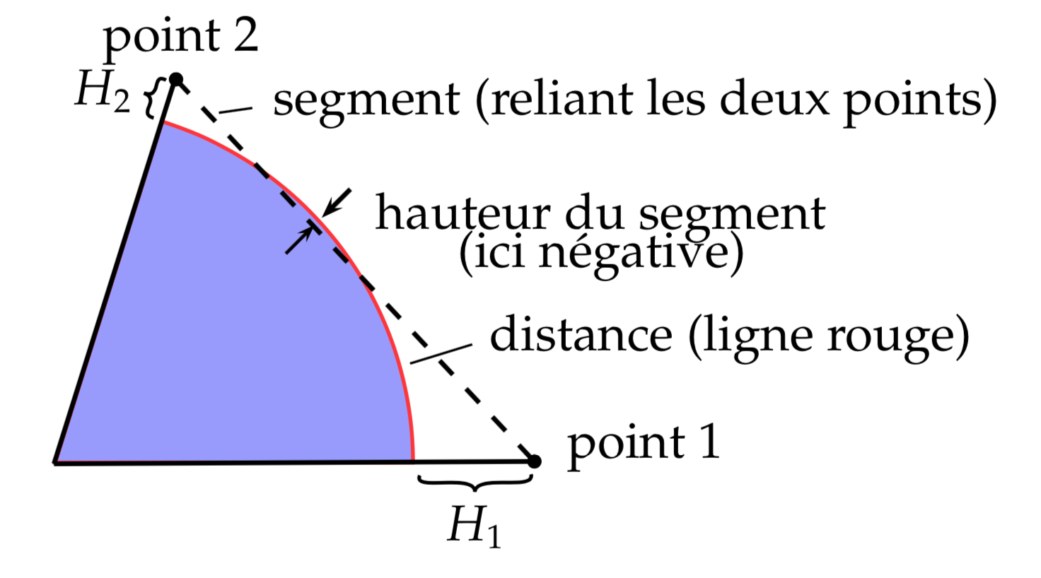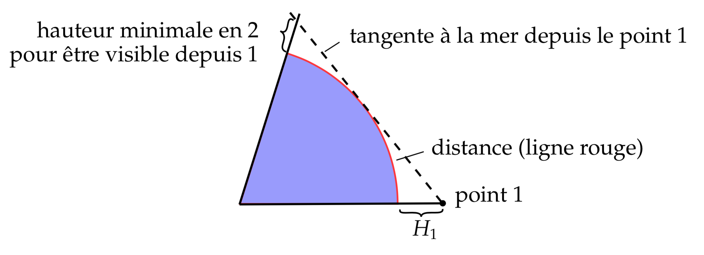 | Hauteur du point 2 nécessaire pour être visible depuis le point 1 |